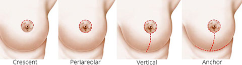 The breast lift with the least scarring is the periareolar or Benelli breast lift, which has a scar just around the areola and no vertical scar. In this lift a larger circle is drawn out from the areola, the top of this outer circle placed where the areola will be raised, and an inner circle is drawn within the areola (designed to reduce the size of a stretched-out areola). The skin between is removed, a purse-string suture is placed at the outer circle and cinched down around the inner, smaller circle, thus tightening the skin, reducing the areola size, and raising the nipple position.